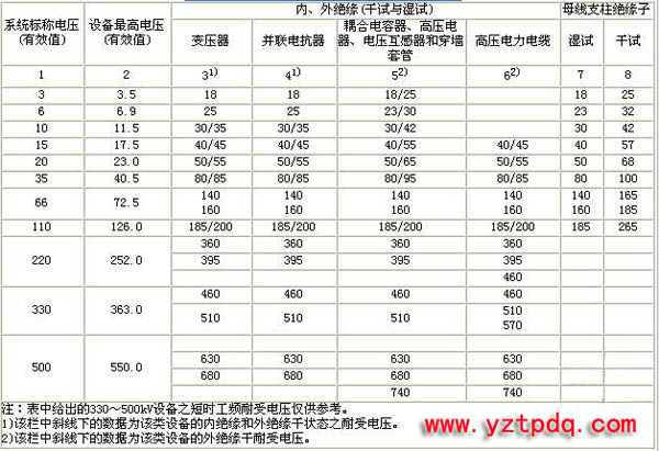 各類設備短時(1min)工頻耐受電壓(有效值)表
