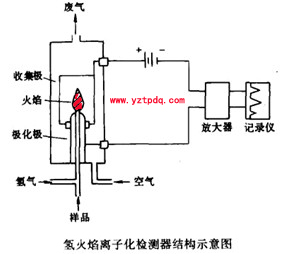 氫焰檢測(cè)器(FID),由Harley和Pretorious 發(fā)明, 演化自Scott發(fā)明的燃燒熱檢測(cè)儀(Heat of Combustion Detector)。FID用氫氣作為燃燒氣,其中摻有氦氣,氮?dú)獾认疵搫?,在一個(gè)圓筒狀的電極里的噴嘴處燃燒。 噴嘴與電極間電壓高達(dá)幾百伏,當(dāng)含碳溶質(zhì)在噴嘴處燃燒時(shí),產(chǎn)生的電子/離子對(duì)被噴嘴和電極處收集起來(lái)產(chǎn)生電流,該電流被放大并傳送到記錄儀或電腦數(shù)據(jù)采集系統(tǒng)的A/D轉(zhuǎn)換器處。