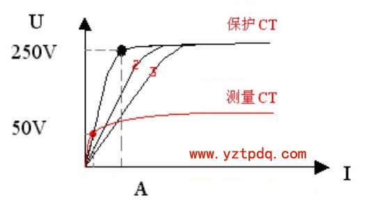 2、測得的伏安特性曲線與過去或出廠的伏安特性曲線比較,電壓不應(yīng)有顯著降低。若有顯著降低,應(yīng)檢查二次繞組是否存在匝間短路。當(dāng)有匝間短路時,其曲線開始部分電流較正常的略低,如圖中曲線 2、3 所示(指保護 CT 有匝間短路,曲線 2 為短路 1 匝,曲線 3 為短路 2 匝),因此,在進行測試時,在開始部分應(yīng)多測幾點。