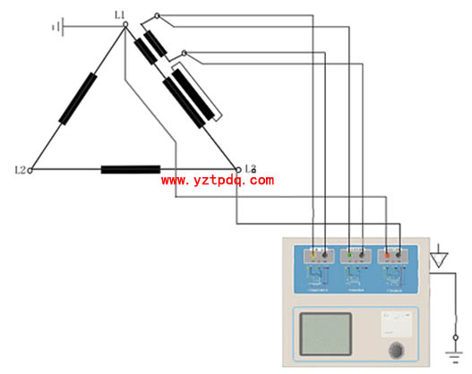 圖1-2 TPHGC-B變頻式互感器綜合測試儀在三角形接法變壓器上進行測試時的接線方式