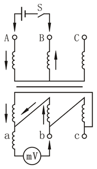圖1-2 直流法測三相變壓器聯(lián)接組標(biāo)號(hào)的接線圖