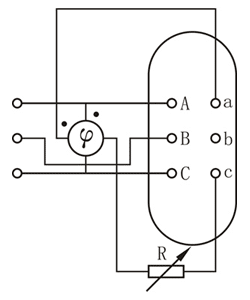 試驗(yàn)時(shí),相位表的電壓線圈按圖所示極性接于被試品的高壓,電流線圈通過一個(gè)可變電阻接入被試品低壓的對(duì)應(yīng)端子上。當(dāng)被試變壓器高壓通入三相交流電壓時(shí),在其低壓感應(yīng)出一個(gè)一定相位的電壓。由于介入法人是一個(gè)電阻負(fù)荷,所以低壓側(cè)電流和電壓同相位。因此可以認(rèn)為高壓電壓對(duì)低壓電流的相位就等于高壓電壓對(duì)低壓電壓的相位,根據(jù)相位表所測得的相位差即可知高、低壓間的時(shí)鐘序號(hào)即聯(lián)接組標(biāo)號(hào)。使用相位表法測量時(shí),應(yīng)注意以下問題:
