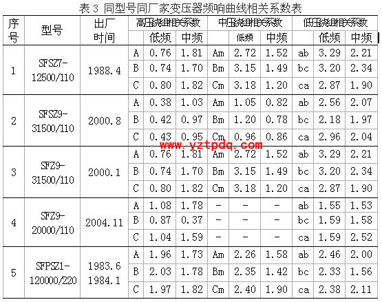 7) 同型號同廠家變壓器頻響曲線相關(guān)系數(shù)分析:對宜昌電網(wǎng)中5種型號的10臺變壓器(其中220KV變壓器2臺,110KV變壓器8臺)相關(guān)系數(shù)分析,發(fā)現(xiàn)同型號變壓器低壓側(cè)對應(yīng)繞組頻響曲線一致性明顯好于中高壓側(cè)繞組,高壓側(cè)一致性最差。具體數(shù)據(jù)見表3,原因在于:一,高壓套管位置較高,受感應(yīng)電壓影響較大;二是引線與套管之間的雜散電容的影響。因此在實際判斷繞組有無變形時,若無原始曲線需要與同廠同型同期變壓器測試結(jié)果相比較時,應(yīng)對高中低三側(cè)繞組區(qū)別對待,高壓側(cè)繞組頻響曲線僅有參考價值。