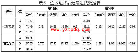 3) 2004年12月8日,雨天,10KV黃磷二回古21開關(guān)因線路接地,產(chǎn)生過電壓,導(dǎo)致10KV母線短路,古老背2#主變差動速斷動作,2#主變?nèi)齻?cè)開關(guān)跳閘。當天我們進行了繞組變形試驗,通過與歷史曲線對比,我們發(fā)現(xiàn)中低壓側(cè)頻響曲線一致性相當好,但高壓繞組A相高頻段相關(guān)系數(shù)為1.33,分析頻響圖譜發(fā)現(xiàn)相關(guān)系數(shù)不好的原因不是波峰波谷的變化,而是A相繞組在2K頻率下幅值比歷史曲線低。短路阻抗測試結(jié)果顯示高壓對低壓三相繞組電抗值相差僅0.736%,高壓對低壓繞組短路阻抗與銘牌值相比,相差1.506%,高壓對中壓短路阻抗值與銘牌值相差0.99%,見表5。直流電阻測量也顯示無匝間或?qū)娱g短路。該變壓器原為無載調(diào)壓變壓器,在城網(wǎng)改造中進行過無載改有載改造,將高壓中性點解開,拆分為X、Y、Z后外加三只套管引出,通過三根跳線引至調(diào)壓變壓器。試驗時因雨未將架空線與X、Y、Z三只套管解開,而是直接將架空線與調(diào)壓變的聯(lián)結(jié)解開,這樣A 相繞組尾端末懸空并連有約2m長的跳線。2K頻率下繞組響應(yīng)幅值比歷史曲線下降的原因在于引線未拆除。 引線感應(yīng)電壓的影響(1#主變?nèi)栽谶\行,相距約4米)、引線與高壓A相套管的接觸不良均會造成此現(xiàn)象發(fā)生。因此我們下出高壓繞組A相無變形的結(jié)論,目前該變壓器一直安全運行。