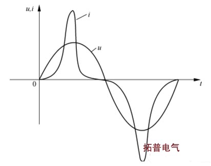 空載時,電流很小,鐵芯處于非線性區(qū),電流發(fā)生畸變,其波形比普通的正弦波要“尖”,通常稱為“尖頂波”。電流增大后,這種現(xiàn)象會隨之消失,當(dāng)電流過大時,會進(jìn)入另一端非線性區(qū)域,電流又會發(fā)生畸變。
