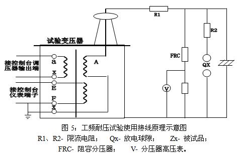 1、TPSBJ系列高壓試驗(yàn)變壓器做工頻耐壓試驗(yàn)使用接線方法見(jiàn)圖5。做工頻耐壓試驗(yàn)前,先根據(jù)試驗(yàn)變壓器的額定容量選擇好限流電阻,(水電阻)的阻值,再根據(jù)被試品需加的高壓電壓值調(diào)整好放電球隙的球間距,為了提高對(duì)被試品施加電壓的測(cè)量精度,應(yīng)在高壓側(cè)接入FRC阻容分壓器來(lái)測(cè)量電壓。