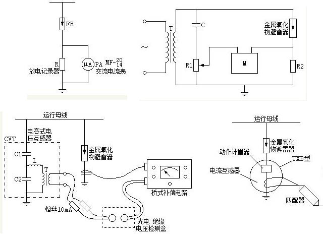 一類(lèi)是同時(shí)需用運(yùn)行相電壓的橋式補(bǔ)償電路或類(lèi)似的電子儀器,接線方式見(jiàn)圖。試驗(yàn)時(shí)將電壓監(jiān)測(cè)盒接到CVT二次端子上,將帶有磁屏蔽罩的鉗形電流互感器鐵芯夾在避雷器的接地線上,不需拆斷接地線。由于橋式補(bǔ)償電路或類(lèi)似的阻性電流測(cè)試儀測(cè)試時(shí),需從電壓互感器二次端子上取運(yùn)行相電壓作為儀器的標(biāo)準(zhǔn)電壓,為預(yù)防測(cè)試過(guò)程中若儀器處不慎將電壓線短路,影響CVT二次電壓的正常工作,應(yīng)采用光電絕緣式電壓監(jiān)測(cè)盒的阻性電流測(cè)試儀,或在CVT二次電壓端子上并聯(lián)一個(gè)高阻抗分壓器的方法進(jìn)行標(biāo)準(zhǔn)電壓取樣?,F(xiàn)場(chǎng)實(shí)踐證明,采用在CVT二次端子上并聯(lián)的高阻抗分壓器低壓臂取標(biāo)準(zhǔn)電壓時(shí),即使高阻抗分壓器的低壓臂發(fā)生短路,也不會(huì)影響CVT二次電壓的正常工作。判斷避雷器質(zhì)量情況時(shí),將測(cè)得值與初始值相比較,若阻性分量增加到初始值的1.5倍時(shí),應(yīng)適當(dāng)縮短測(cè)量周期;若阻性分量增加到初始值的2倍時(shí),應(yīng)立即停電檢查。試驗(yàn)時(shí)要記錄氣象條件,當(dāng)測(cè)試時(shí)的環(huán)境溫度高于或低于測(cè)試初始值的環(huán)境溫度時(shí),應(yīng)將此時(shí)所測(cè)的阻性分量電流值進(jìn)行溫度換算后,才能與初始值相比較,溫度換算的方法參照文章《避雷器電導(dǎo)電流和直流U1mA及0.75U1mA下漏電流的測(cè)量方法》中第4條?,F(xiàn)場(chǎng)實(shí)踐表明,對(duì)一字形排列的三相110kV~500kV金屬氧化物避雷器,由于相間雜散電容禍合影響,會(huì)對(duì)這種測(cè)量方法產(chǎn)生誤差,應(yīng)予以注意,解決這種問(wèn)題的簡(jiǎn)便辦法是:不論影響程度如何,只需將避雷器各自的前后測(cè)試數(shù)據(jù)單獨(dú)進(jìn)行比較,按照上述判斷依據(jù),一般也能發(fā)現(xiàn)問(wèn)題。目前在此基礎(chǔ)上,已研制出采用移相補(bǔ)償原理的阻性電流測(cè)量?jī)x器,能基本上消除相間電容干擾的影響。