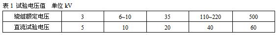 記錄頂層油溫及環(huán)境溫度和濕度。確認(rèn)一切正常后開(kāi)始試驗(yàn)。先空載分段加壓至試驗(yàn)電壓,以檢查試驗(yàn)設(shè)備絕緣是否良好、接線是否正確。將直流電源輸出加在被試變壓器繞組上,測(cè)量時(shí),加壓到0.5倍試驗(yàn)電壓,待1min后讀取泄漏電流值。然后加壓到試驗(yàn)電壓,待1min后讀取泄漏電流值。被測(cè)繞組試驗(yàn)完畢,將電壓降為零,切斷電源,必須充分放電后再進(jìn)行其他操作。試驗(yàn)結(jié)果判斷依據(jù)試驗(yàn)電壓見(jiàn)表1。
