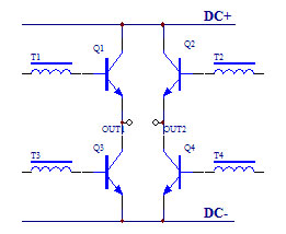 圖中,Q1~Q 4為四個(gè)等效三極管,分別對(duì)應(yīng)變電源的四個(gè)橋臂。每個(gè)橋臂由數(shù)千只三極管并聯(lián)組成,并采取了有效的均衡電流措施。正半周時(shí),前級(jí)放大信號(hào)通過(guò)推動(dòng)變壓器(T1~T4)作用于Q1~Q4三極管的基極,Q2,Q3截止;Q1,Q4導(dǎo)通,電流由Q1至負(fù)載再到Q4形成正弦波的正半周。負(fù)半周時(shí)模擬信號(hào)推動(dòng)Q2,Q3的基極,Q1,Q4截止,Q2,Q3導(dǎo)通, 電流由Q3至負(fù)載再至Q2形成正弦波的負(fù)半周, 從而在負(fù)載上構(gòu)成一個(gè)完整的正弦波。