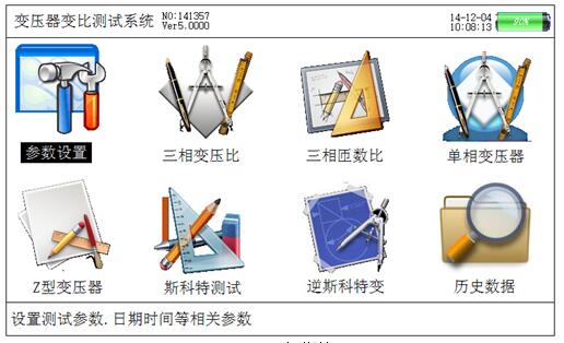 當(dāng)開機(jī)后顯示主菜單,如圖所示的主菜單界面。主菜單共有八個(gè)功能選項(xiàng),包括:參數(shù)設(shè)置、三相變壓比、三相匝數(shù)比、單相變壓器、Z型變壓器、斯科特測試、逆斯科特變、歷史數(shù)據(jù),通過↑、↓、←、→鍵進(jìn)行選擇,選中的項(xiàng)目文字為反白顯示(圖中選中項(xiàng)目為“參數(shù)設(shè)置”),按確定鍵進(jìn)入相應(yīng)功能界面;屏幕頂端一行顯示狀態(tài)參量,包括:程序版本號,日期時(shí)間等,同時(shí)顯示出內(nèi)部電池的電壓幅值和剩余電量,以便操作人員隨時(shí)觀察儀器電池狀態(tài),當(dāng)發(fā)現(xiàn)電池虧電時(shí)可及時(shí)充電;屏幕下方一行為提示欄,為用戶進(jìn)行簡單的操作提示,方便用戶正確操作。