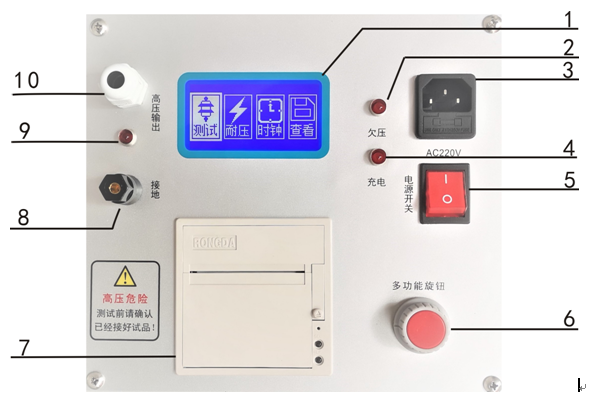 10、高壓輸出端(連接避雷器的一端,當(dāng)開始測量時,此端輸出直流高壓,請注意安全!測試前請連接好被試品,請勿空載測試?。?br />