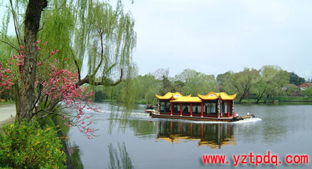 杜牧的“青山隱隱水迢迢,秋盡江南草未凋。二十四橋明月夜,玉人何處教吹簫。”一詩使二十四橋名聲不斐。二十四橋還有兩種說法:一說指二十四座橋,宋代沈括在《補(bǔ)筆談》中,對(duì)二十四橋一一考證,論證揚(yáng)州確有二十四座橋;一說指一座橋,《揚(yáng)州鼓吹詞》中寫道“是橋因古之二十四美人吹簫于此,故名”。我倒覺得又或許詩人未必是實(shí)指,而是泛指好多橋吧。過了二十四橋再往北就沒什么景點(diǎn)了,于是往回走,一路清風(fēng)徐來,但見細(xì)柳拂岸,水波蕩漾,好不愜意,果然是“兩堤花柳全依水,一路樓臺(tái)直到山”的景象,風(fēng)光旖旎,引人流連。
