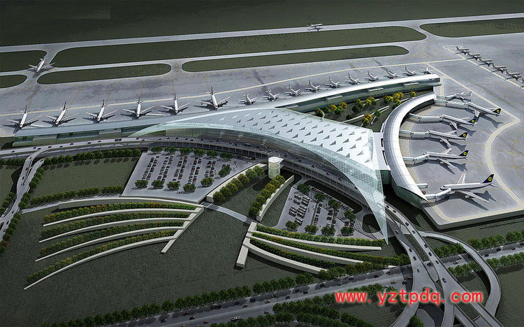 在機(jī)場(chǎng)航站樓效果圖上,作者發(fā)現(xiàn)航站樓平面形狀為扇形,地上二層,屋面為雙螺旋曲面構(gòu)造體系。據(jù)介紹,機(jī)場(chǎng)航站樓由美國(guó)蘭德隆與布朗有限公司設(shè)計(jì),建筑造型新穎,采用鋼結(jié)構(gòu)屋面,為斜交網(wǎng)格結(jié)構(gòu),具有三維動(dòng)感立體視覺效果。在機(jī)場(chǎng)航站樓前,是一個(gè)半月形的人工湖。“月光下的一彎‘藍(lán)月’,像一面明鏡特別迷人,體現(xiàn)出‘天下三分明月夜,二分無賴是揚(yáng)州’的月亮文化特色。”施工人員介紹說。