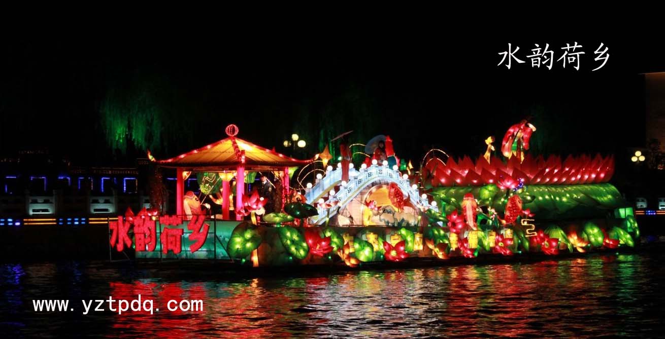 “水韻荷鄉(xiāng)”號花船由揚州拓普電氣科技有限公司所在地寶應(yīng)縣承制的。寶應(yīng)歷史悠久、人杰地靈,素有“寶地”美譽。整個花船以“生態(tài)、綠色”為主題,展現(xiàn)了“萬頃荷花別樣紅,捧出綠色也醉人,水鮮美食遠(yuǎn)名揚”的寶應(yīng)生態(tài)畫廊情景,更寓意著古寶應(yīng)的靈氣,水寶應(yīng)的秀氣,洋寶應(yīng)的大氣。