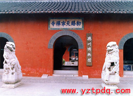 抗日戰(zhàn)爭(zhēng)期間,天寧寺為侵華日軍所占,淪為兵營。由于年久失修,使用不當(dāng),至70年代末,已面目全非。自1984年夏,共耗資141萬元進(jìn)行大修。大修后的天寧寺占地908平方米,建筑面積5000多平方米,中軸線上有山門殿、天王殿、大雄寶殿、華嚴(yán)閣,兩側(cè)廊房92間。整個(gè)建筑布局對(duì)稱、嚴(yán)謹(jǐn)。山門殿單檐歇山頂,面闊3間。天王殿亦為單檐歇山頂,四面有廊,面闊5間284米。大殿重檐歇山頂,四面有廊,前后有月臺(tái),面闊5間328米,進(jìn)深15檁25米,脊檁高19米。殿后走廊東壁嵌有清同治十一年(1872年)立《重修天寧寺碑》,西壁嵌有1987年立《重修天寧寺碑記》。修復(fù)后,用作揚(yáng)州博物館新址,對(duì)外開放。