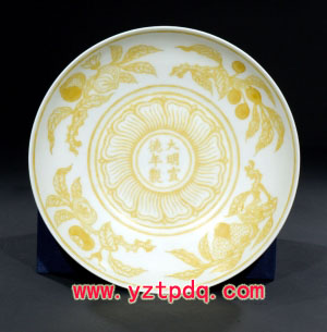 通體以釉上黃彩裝飾,內(nèi)外壁分別飾四組折枝瓜果紋和纏枝蓮紋,盤心印有黃彩“大明宣德年制”楷書款,周邊被一圈花瓣裝飾。這件明宣德黃彩花卉紋盤,世界上僅存兩件,其中一件陳列在大英博物館內(nèi)。“這件作品珍貴之處在于它的工藝制作,黃釉極難上色,因此它只能用剪紙貼在兩壁,再細(xì)細(xì)勾勒。”上海天物館館長(zhǎng)錢偉鵬介紹。