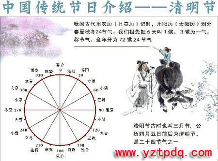 中華民族的傳統(tǒng)節(jié)日-清明節(jié)大約始于周代,已有二千五百多年的歷史。清明最開始是一個很重要的節(jié)氣,清明一到,氣溫升高,正是春耕春種的大好時節(jié),故有“清明前后,種瓜種豆”。“植樹造林,莫過清明”的農(nóng)諺。后來,由于清明與寒食的日子接近,而寒食是民間禁火掃墓的日子,漸漸的,寒食與清明就合二為一了,而寒食既成為清明的別稱,也變成為清明時節(jié)的一個習(xí)俗,清明之日不動煙火,只吃涼的食品。