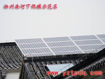 昨天上午,記者在南河下低碳示范區(qū)內(nèi)看到,戶外路燈已經(jīng)安裝結(jié)束。項(xiàng)目負(fù)責(zé)人介紹,這些路燈都是采用的節(jié)能燈,電源全部來(lái)自太陽(yáng)能光伏板發(fā)電。項(xiàng)目負(fù)責(zé)人將記者帶進(jìn)項(xiàng)目展示區(qū)的3號(hào)樓二樓平臺(tái),兩名技術(shù)人員正在平臺(tái)一個(gè)“人”字頂上安裝光伏板,光伏板面積為10多平方米。“光伏板分別安裝在3號(hào)樓和11號(hào)樓平臺(tái)上,共有24塊板子,總發(fā)電能力為4.32千瓦。”該項(xiàng)目負(fù)責(zé)人介紹,整個(gè)路燈的供電全部依賴上述太陽(yáng)能發(fā)電。