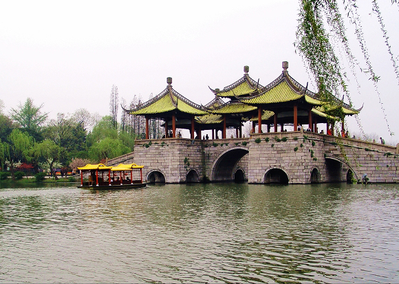 五亭橋就是少女身上那條華美的腰帶。五亭橋不但是瘦西湖的標志,也是揚州城的象征。它建于清乾隆二十二年,至今已有了兩百多年的歷史。