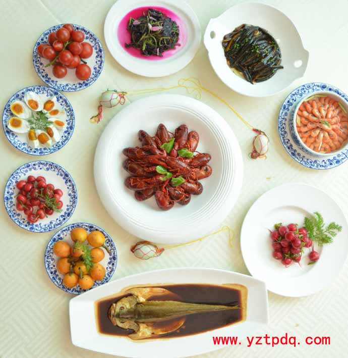 每到端午節(jié)的這一天,揚(yáng)州人家中午一定要回家“嘗午”。所謂“嘗午”就是吃十二紅,是揚(yáng)州人過(guò)端午節(jié)特有的習(xí)俗。“十二紅”是指十二樣自然紅色,或經(jīng)烹調(diào)后顏色發(fā)紅的時(shí)令菜肴,通常有咸鴨蛋、煮黃魚(yú)、粉皮拌黃瓜、炒蝦子、炒紅莧菜、燒仔鵝、洋花蘿卜、櫻桃、枇杷、紅杏、干菜燒肉、炒長(zhǎng)魚(yú)、紅燒扒蹄、火腿、香腸、雄黃酒等。一般分為4碗8碟,即4個(gè)涼拌,4個(gè)熱炒,4個(gè)燒菜。這個(gè)數(shù)字代表每年的十二個(gè)月,再者它也兼顧了每年的四時(shí)八節(jié)。