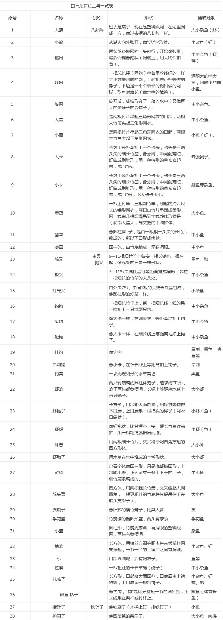 白馬湖區(qū)漁民捕魚工具一覽表