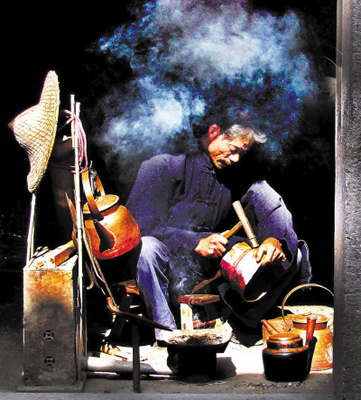 老揚(yáng)州人家都喜歡銅器,那時(shí)候,一般家庭所使用的器皿都離不開(kāi)銅器,婚嫁時(shí)必備兩個(gè)銅盆,子孫滿月又要送個(gè)銅盆、一雙銅筷子,父母過(guò)六十大壽,子女照例會(huì)送上一個(gè)銅盆,寓意父母金盆洗手可以享清福了。以前揚(yáng)州一帶人家以擁有銅器為榮,使用銅器多的便是大戶人家。但到了“大躍進(jìn)”大煉鋼鐵時(shí),人們紛紛把銅器捐了出來(lái),銅器從此在日常生活中“淡出”,銅器鋪相繼關(guān)門(mén),可銅匠擔(dān)仍然活躍在街頭巷尾。