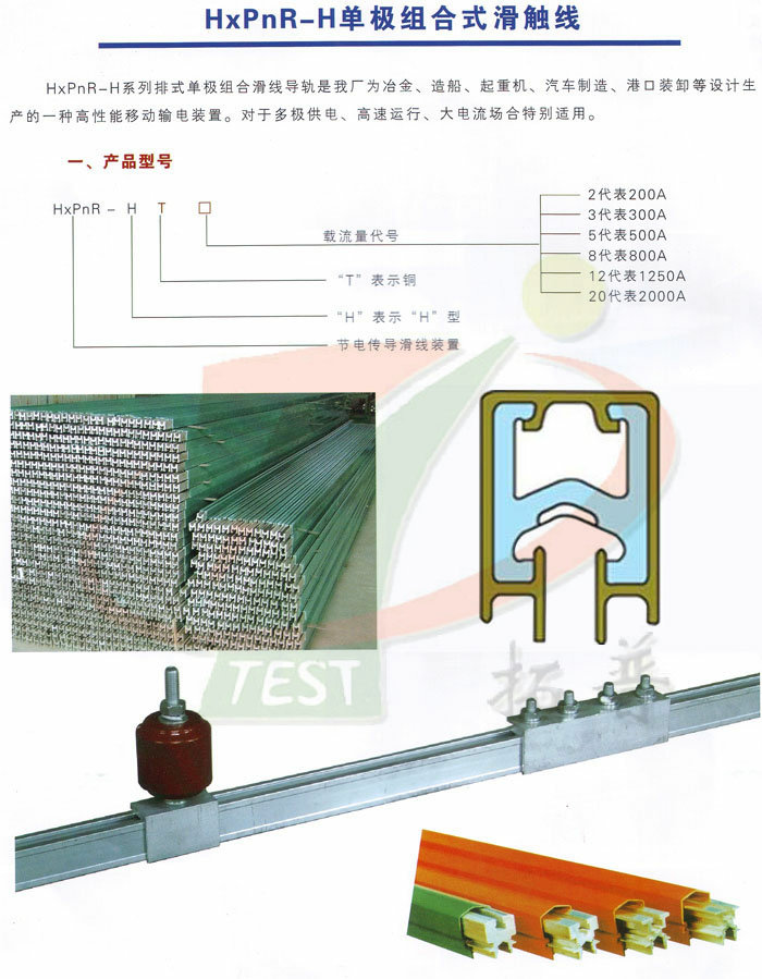 HXPnR-H 系列單極組合式滑觸線由H型鋁合金本體導(dǎo)軌加壓V型不銹鋼滑接帶、PVC絕緣外殼、外置式集電器以及懸吊、固定等組件組合而成。該產(chǎn)品以其設(shè)計(jì)新穎、結(jié)構(gòu)合理、維護(hù)方便、使用安全等特點(diǎn)被廣泛應(yīng)用于電流較大、使用頻率較高、運(yùn)行速度快和環(huán)境較差的場合。